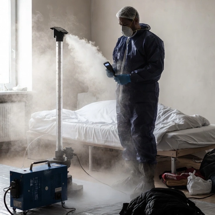 Во время обработки находиться в помещении нельзя. После завершения и проветривания помещение полностью безопасно.